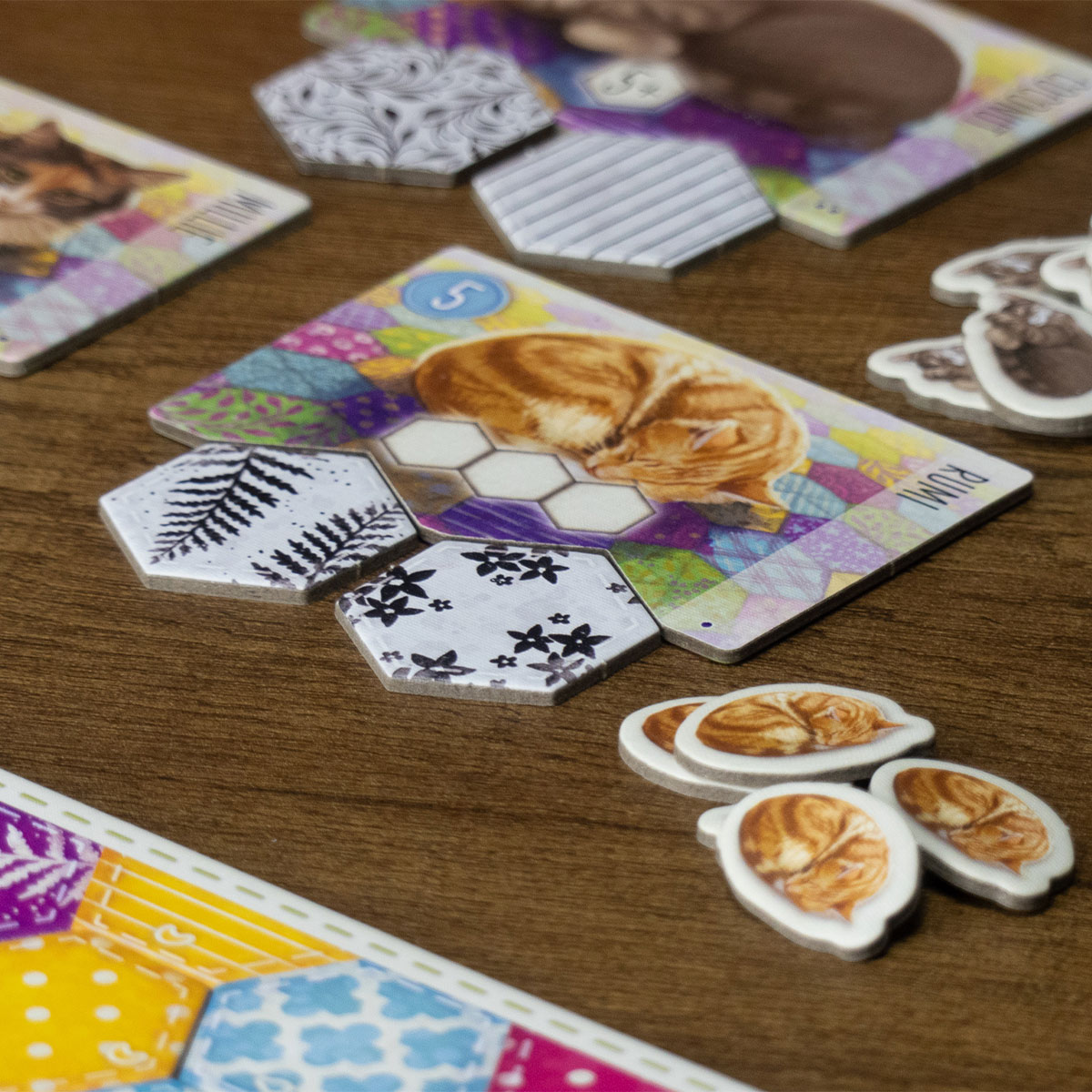 En Calico, los jugadores compiten para tejer la colcha mas cómoda cogiendo y colocando parches de diferentes colores y estampados en su tablero de colcha. Cada tablero tendrá 3 objetivos de diseño que otorgarán puntos si se cumplen sus requisitos. Los jugadores intentarán además crear grupos de estampados para atraer a los gatos más adorables y grupos de colores en los que coser botones. ¡El jugador que obtenga más puntos por sus diseños, gatos y botones, gana la partida