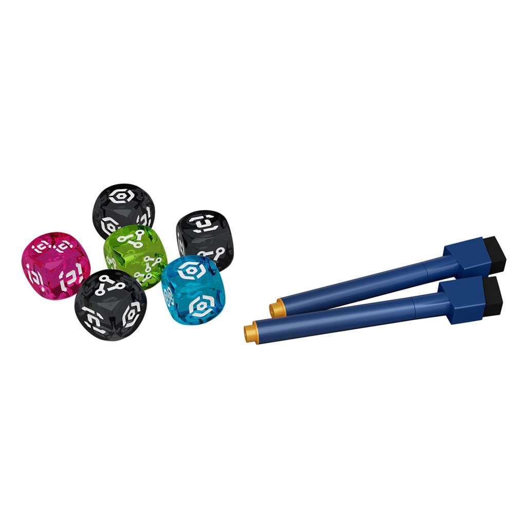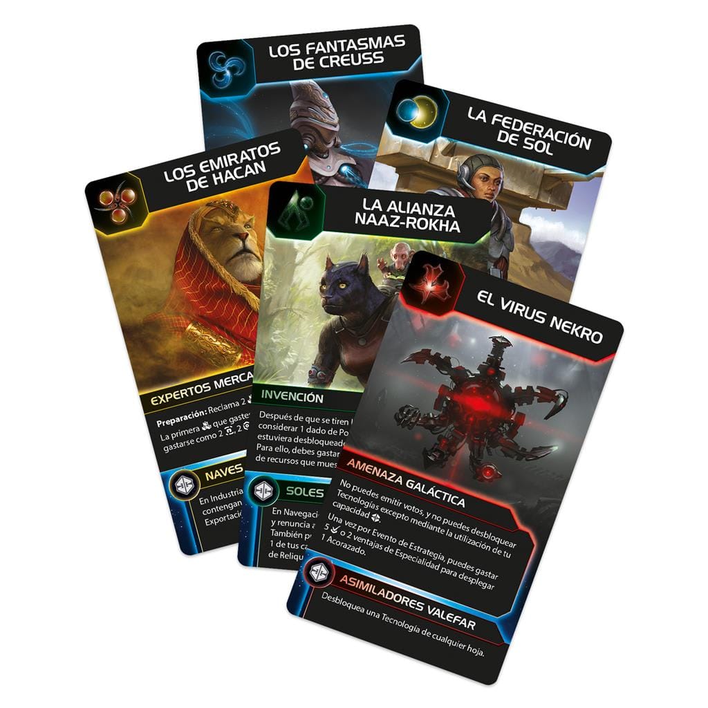 32 hojas de jugador, 1 hoja de Mecatol Rex, 8 rotuladores de tiza líquida 3 dados negros, 3 dados de Potenciación, 24 cartas de Facción 25 cartas de Evento, 12 cartas de Objetivo, 16 cartas de Reliquia, 12 cartas de Plan, 8 cartas de Referencia, 1 carta de Portavoz , Guía de «Aprende jugando», Reglamento