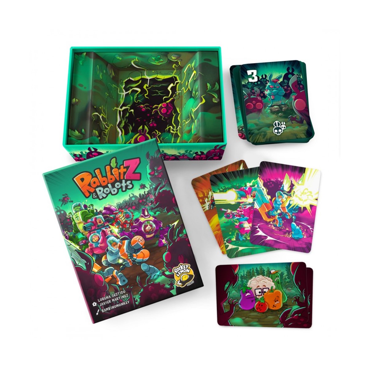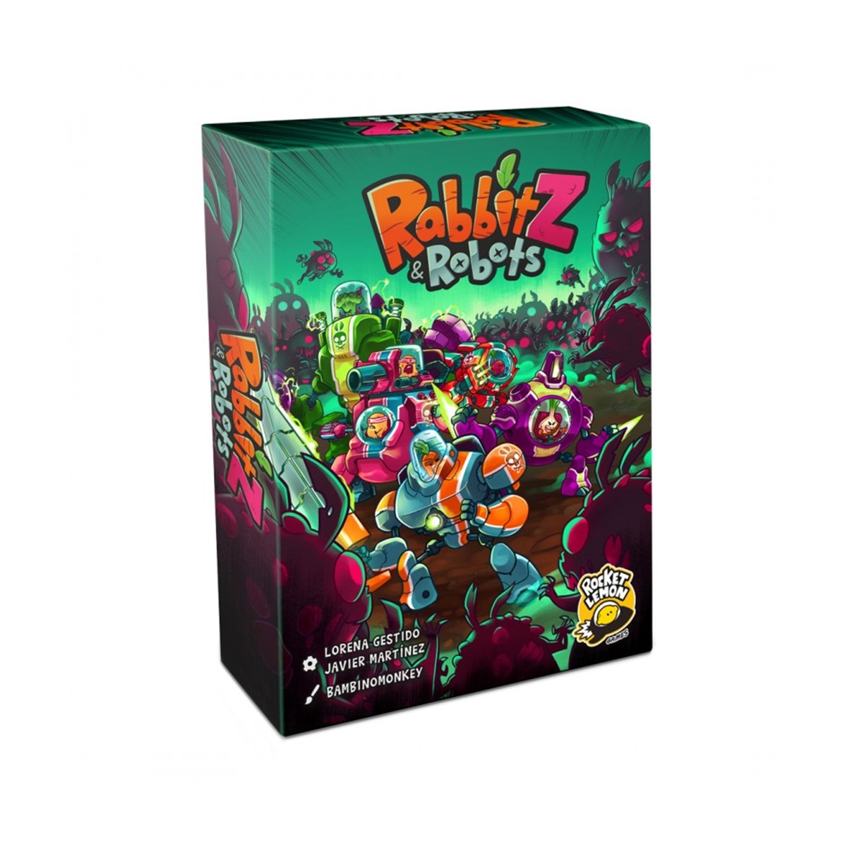 RabbitZ & Robots es un juego de Lorena Gestido y Javier Martínez e ilustrado por Bambinomonkey. Si al final de la invasión eres el jugador con menos puntos negativos en su Huerto, serás el ganador.