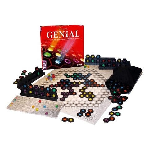 Salido de los talleres del genio en el arte del diseño de juego de temática “abstracta”, Reiner Knizia, Genial representa una excelente alternativa para aquellos jugadores que buscan ejercitar su mente sin dejar de lado la entretención en familia. El juego consta de tres componentes: un tablero ampliable, un marcador de puntuación con peones y 120 piezas hexagonales dobles con símbolos y colores. Al comenzar, cada jugador pone sus seis contadores en el primer casillero de su marcador de puntuación y roba seis piezas dobles al azar. En cada turno irá ubicando sus piezas sobre el tablero de tal manera que uno de sus símbolos coincida con el de otra pieza formando filas de símbolos en distintas direcciones, las que le otorgarán un determinado puntaje dependiendo de la cantidad de espacios que ocupe cada fila dentro del tablero. De acuerdo a esto, el jugador podrá avanzar en su marcador de puntuación el peón del color respectivo a la fila de símbolos recién creada, tantos lugares como puntos haya obtenido en la jugada. Cuando el tablero no tenga más espacios vacíos el juego concluirá, el ganador será quien tenga más puntaje, para definir el puntaje de los jugadores sólo se considerara el contador con menos puntaje, por lo cual avanzar con todos los colores es fundamental, de lo contrario perderás rápidamente.