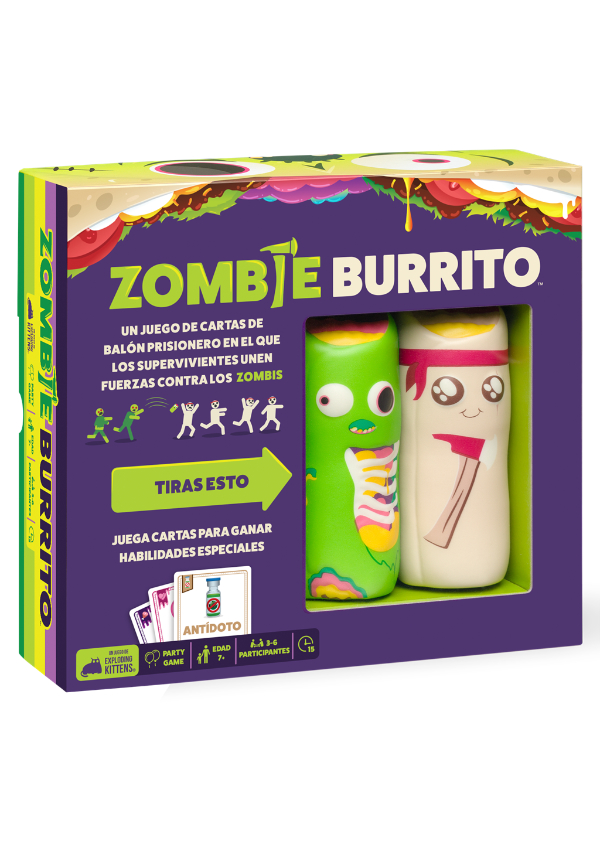 CUIDADO: Este no es un juego de cartas normal. Tendrás que tirar Burritos de espuma blandita a tus amigos y familiares. Así que despeja la zona, recoge la mesa y todo lo que se pueda romper y, si tienes gafas, quítatelas, porque esto va a ser una locura