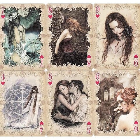 El mundo de fantasía de Victoria, cubre una amplia gama de temas, desde los románticos y mágicos canales venecianos hasta el oscuro inframundo de los vampiros góticos. Los temas clásicos se reinventan y ahora las criaturas cobran vida de una manera única e impactante en estos naipes premium fabricados por Bicycle.