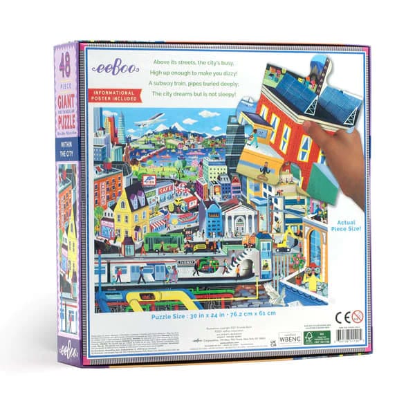 Bajo tierra y por encima de la cabeza, este rompecabezas ilustra la vida y la infraestructura de una ciudad grande y bulliciosa. Los niños disfrutarán encontrando detalles en cada rincón y en cada pieza de este enorme rompecabezas de suelo. Hay descubrimientos por hacer y cosas por aprender a lo largo de todo el juego: vagones de metro, tuberías subterráneas, construcción y la magia y la energía de la vida urbana. La inteligente y fantasiosa artista Linda Bleck ha creado este enorme rompecabezas. Repleto de detalles y encantadores momentos de descubrimiento, este rompecabezas abre un nuevo camino en la categoría de rompecabezas de piso, haciendo de este formato una actividad totalmente educativa y una rica experiencia de juego individual.
