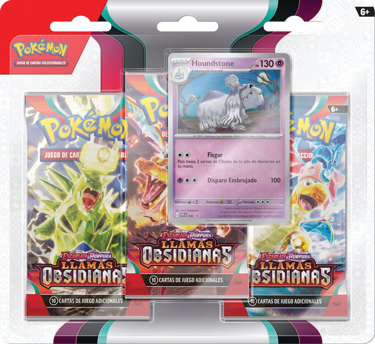 Solo las brasas incandescentes iluminan la noche sombría cuando Charizard ex, en medio de un infierno de chispas ardientes, ¡emerge con nuevos y desconocidos poderes oscuros! Varios Pokémon ex, como Tyranitar, Eiscue y Vespiquen, se ven imbuidos por el deslumbrante fenómeno de la teracristalización, que mutará sus habituales tipos, al tiempo que Dragonite ex y Greedent ex muestran el dominio de sus fuerzas interiores. ¡Y, sin quedarse atrás, Revavroom ex, Melmetal ex y otros Pokémon prometen hacer lo necesario para cambiar el rumbo del combate en la expansión Escarlata y Púrpura-Llamas Obsidianas!