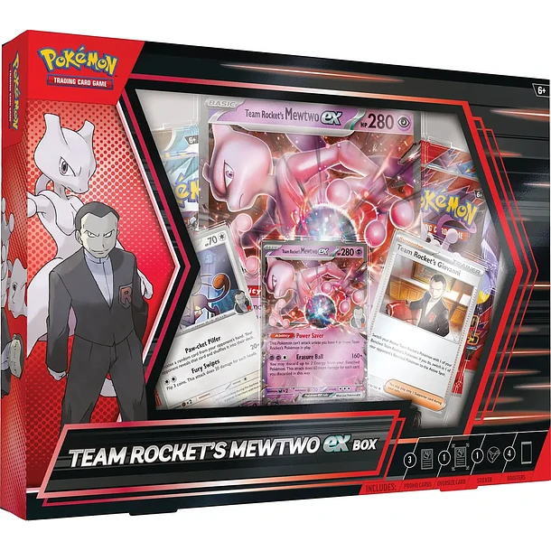 En su búsqueda del poder absoluto y la dominación mundial, ¡Giovanni y el Equipo Rocket desatan la estremecedora fuerza de un temible Pokémon en combate! Cuando Mewtwo ex del Equipo Rocket es respaldado por otros Pokémon del Equipo Rocket, su ataque Bola Aniquiladora puede infligir hasta 280 puntos de daño de un solo golpe. En esta caja encontrarás a este poderoso Pokémon ex como carta promo holográfica junto a Meowth del Equipo Rocket y a Giovanni del Equipo Rocket, además de 1 fotocalcomanía y un montón de sobres de refuerzo.